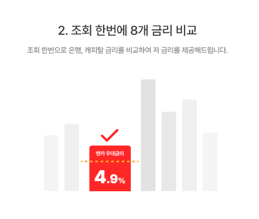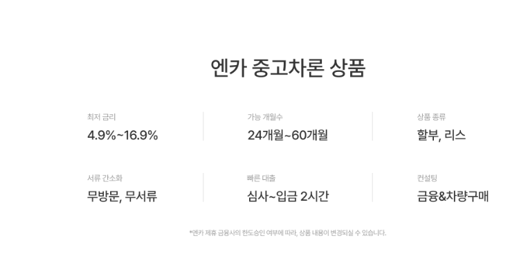 엔카 중고차론은 시중 금리 대비 저렴한 금리 4.9%대로 우대금리 혜택을 받고 차량을 구매할 수가 있습니다.