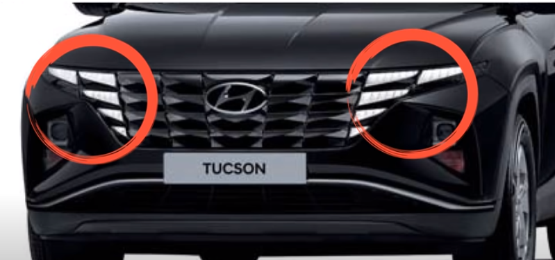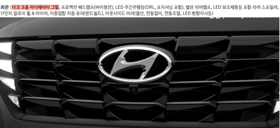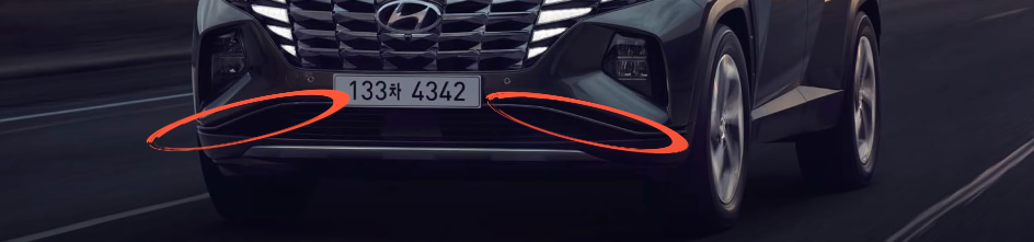 투싼 최상위 트림으로 외관디자인부터 해서 각종 편의옵션들이 다 들어갑니다. 왼쪽이 모던 트림의 해드램프 디자인이고 오른쪽이 인스퍼레이션 트림 해드램프인데 벌브 타입과 LED 타입의 밝기 차이는 생각보다 크게 차이가 납니다. 인스퍼레이션 만의 특별함이 또 있는데요 바로 스키드 플레이드입니다.