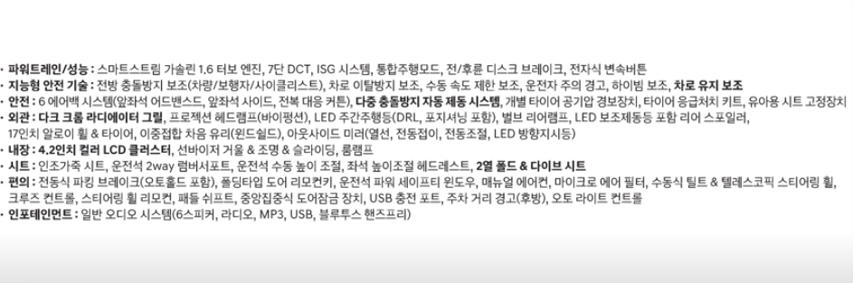 공통사항으로 파워트레인은 1.6 터보 가솔린 엔진에 7 DCT 변속기가 들어갑니다. STOP&GO 역시 연비의 효율을 위해 들어가고 안전옵션인 전방충돌방지보조, 차로이탈방지보조, 6 에어백 시스템, 유아용 카시트 고정장치 등 운전자와 탑승자의 안전을 지켜주는 기본옵션들이 모던 트림에도 잘 들어가 있습니다.
