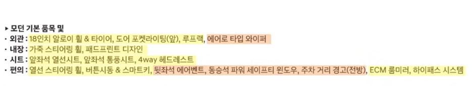 휠에 있어서도 모던 트림의 휠은 17인치에 너무 옛날차 같고 없어 보이는 거 같습니다. 디자인적이나 옵션 실내 인테리어 등 요정도의 차이가 있다는 점 감안하시고 구매에 참고하시면 좋을 거 같습니다.