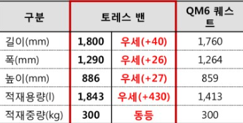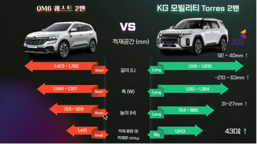 경쟁 모델인 QM6퀘스트 모델과 비교해서 전장부터 전폭 트렁크 용량은 430L나 큽니다.
