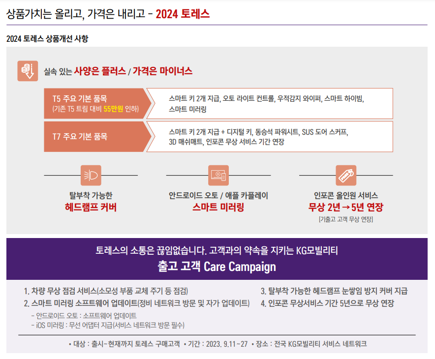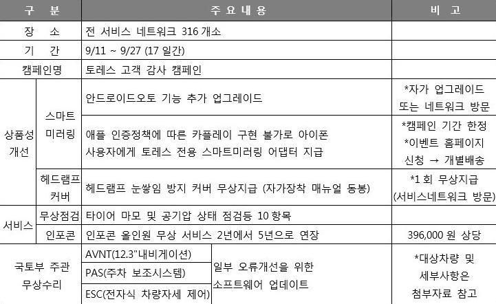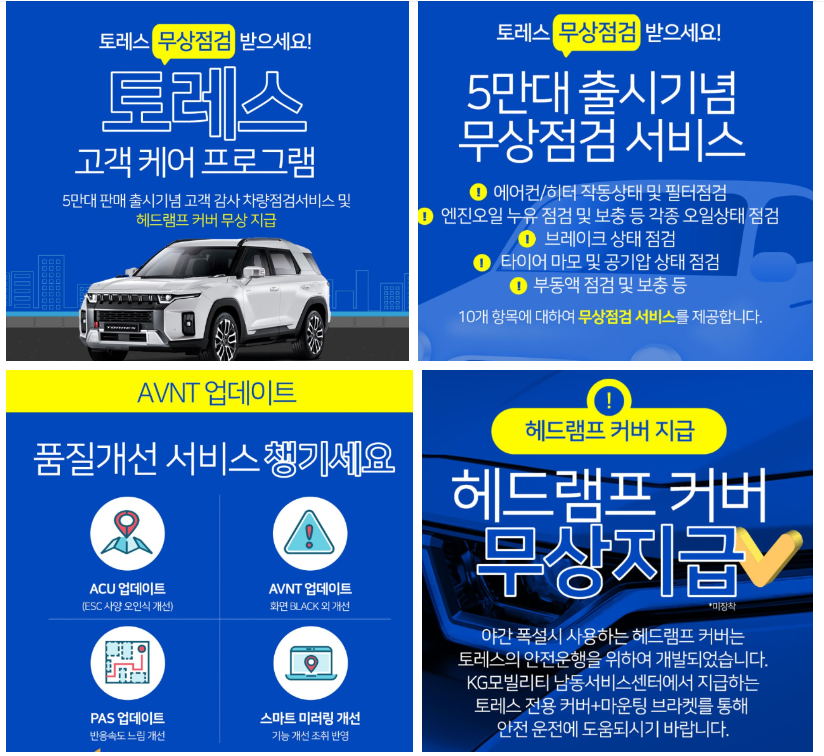 KG모빌리티에서 토레스 5만 대 판매를 기념해 기존 토레스 고 객고 약속했던 스마트 미러링 소프트웨어 업데이트와 , 해드램프 눈 쌓임 방지 커버지급, 인포콘 무상서비스 기간 5년 연장과 안드로이드 오토, 애플카플레이 아이폰의 경우 별도의 미러링 어댑터도 지급한다고 하니 토레스 오너분들은 이 혜택 꼭 누리시길 바랍니다.