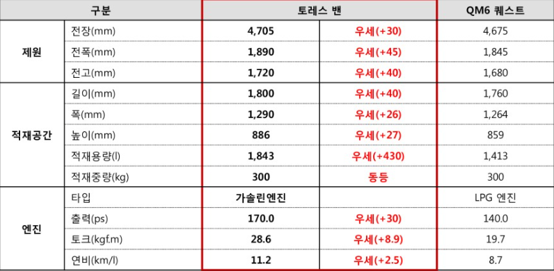 토레스 밴 제원 및 동급차와 비교