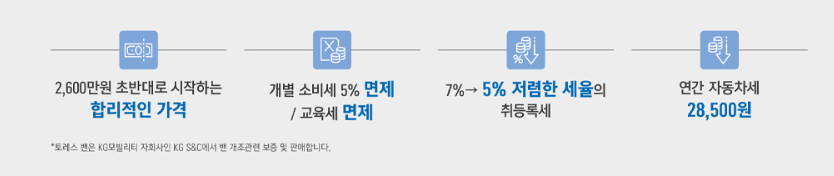 KG 모빌리티는 토레스를 믿고 구매해 준 고객들에게 약속했던 출고 시 미흡했던 부분을 보완해 줄 애프터 서비스 정책을 시행하고 있습니다. 차량을 파는 데에만 그치지 않고 지속적으로 피드백하는 부분에 있어서 믿고 구매할만한 차량이라는 생각이 듭니다. 차를 사는 사람 입장에 있어서 이러한 부분도 상당히 중요하게 체크를 해야 된다는 생각을 하고 토레스 밴을 구매했을 시 혜택에 대해서 정리해 보도록 하겠습니다. 개별소비세 5% 면제, 교육세 면제, 거기다가 가장 큰 부분이 자동차세가 연간 28,500원만 나오고 사업자 분들이 구매 시 부가세 환급까지 받으실 수 있으니 2인승 화물밴이 필요하신 분들은 주저 없이 토레스 밴을 선택하라고 말씀드리고 싶습니다.