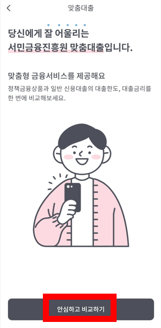 3️⃣ 맞춤대출을 누르면 아래와 같은 화면이 나옵니다. [안심하고 비교하기를 눌러주세요.